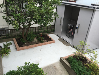 工事期間は5日程度かかりましたが、今までの使っていなかったスペースに物置を置いたことで、収納スペースが増え水引けが良くなり、庭の草処理もなくなったので助かっています(^_-)-☆