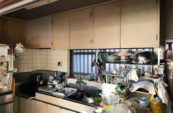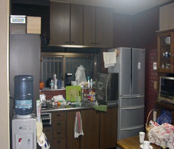 キッチンと床、壁が同系色で全体的に暗く、キッチンの幅がせまく、収納が不便だったため。